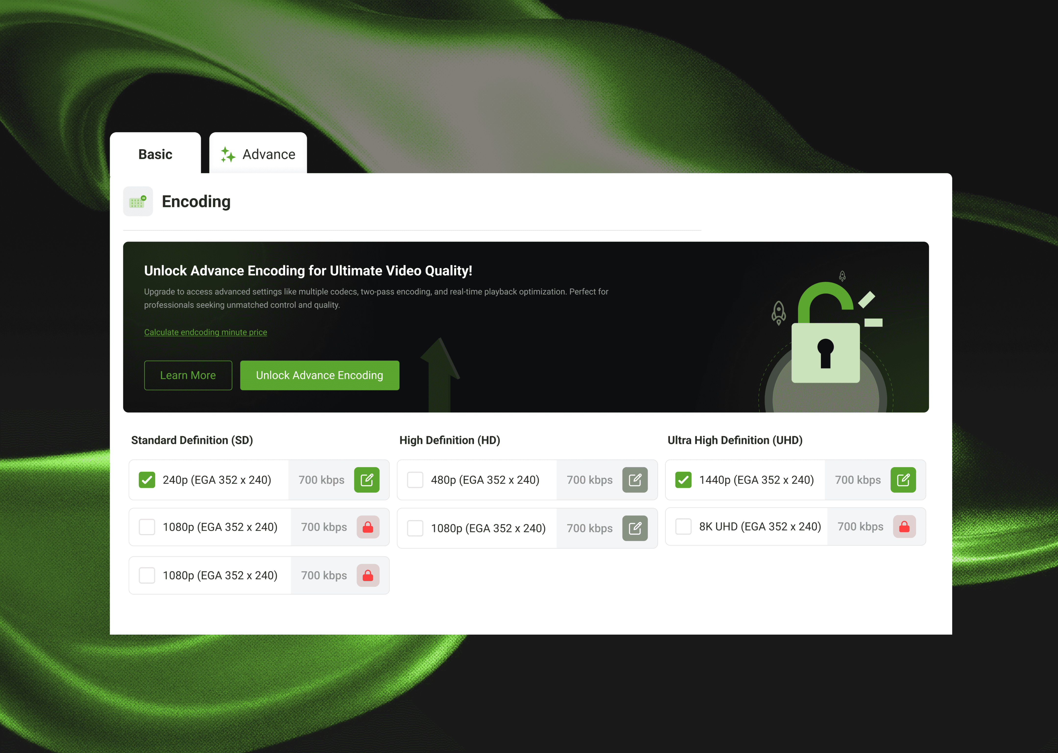 To reduce complexity, I separated the encoding experience into Basic and Advanced modes. I designed clear preset-based controls for beginners, while exposing advanced settings in a locked, explorable format to drive upgrades. Tooltips, banners, and structured settings layouts created a workflow that was powerful yet easy to navigate. In short, my process can be summarized in the following steps